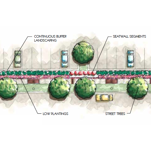 Screen downtown parking areas from with a combination of landscape plant material and segments of brick planter wall. Screening should incorporate the use of low plantings, seatwalls, and planters. Native grasses and shrubs could be incorporated into rain gardens as a best management practice.
